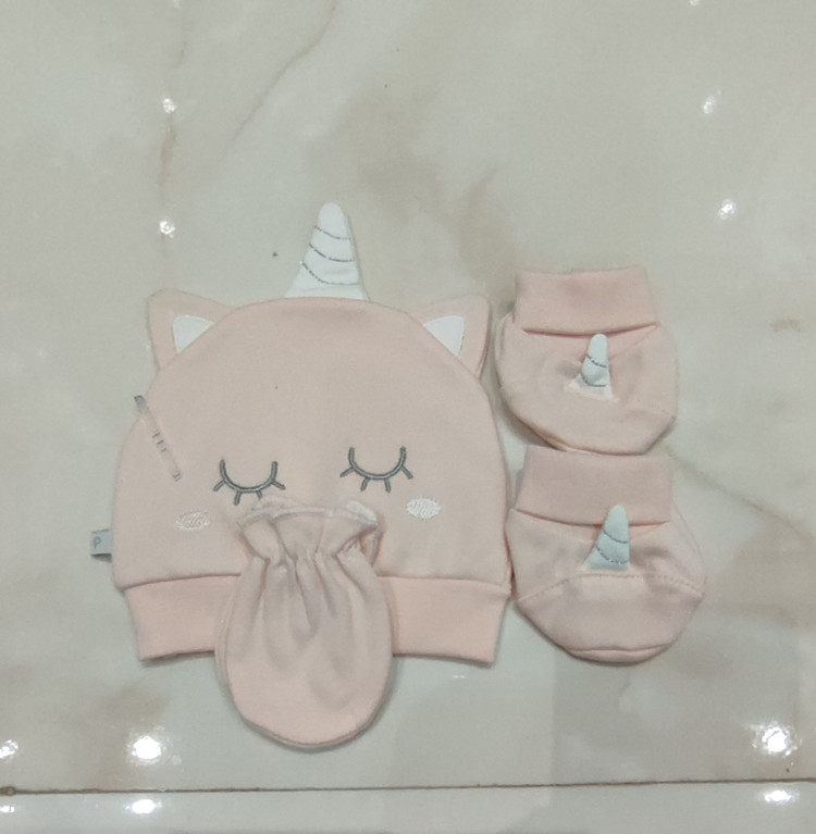 ست کلاه و دستکش و جوراب نوزادی تک سایز در دو رنگ سفید و گلبهی ،جنس،پنبه ،دخترانه(اسب تک شاخ )